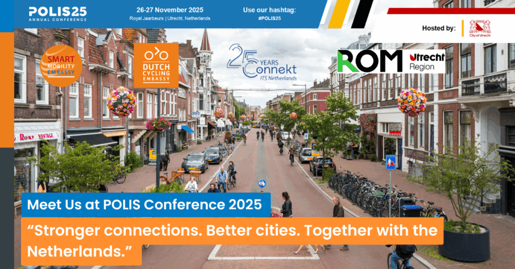 At this year’s POLIS Conference in Utrecht, the Netherlands opens its doors to Europe. Join Connekt (ITS Netherlands), the Smart Mobility Embassy, the Dutch Cycling Embassy, and ROM Utrecht Region at our open networking hub — where innovation meets collaboration.